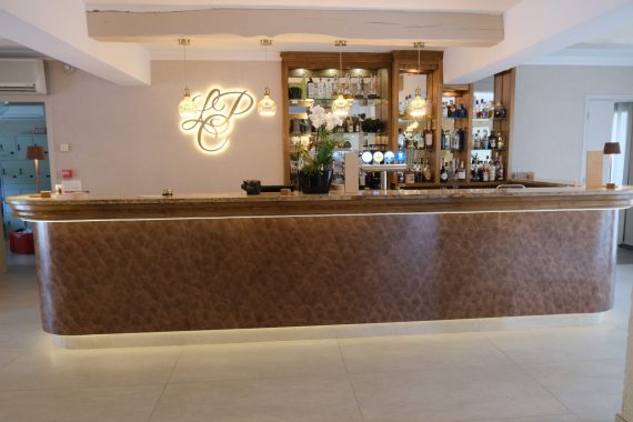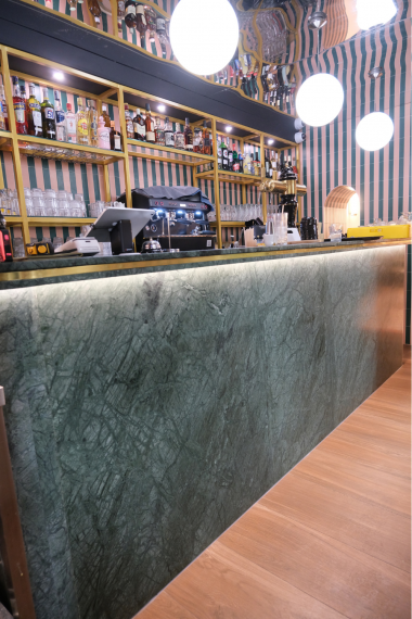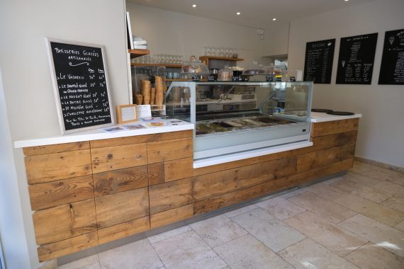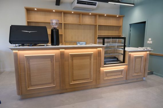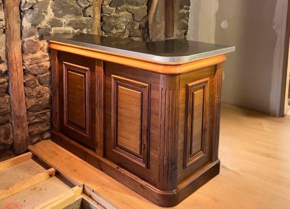 Nous travaillons essentiellement du bois massif (ossatures et décors comptoirs, moulures) tout types de panneaux bois (contre-plaqué, latté, aggloméré) panneaux compacts, stratifiés, mais aussi de l’inox et de l’étain pour les dessus et plinthes de comptoirs du marbre, carrelages etc.…