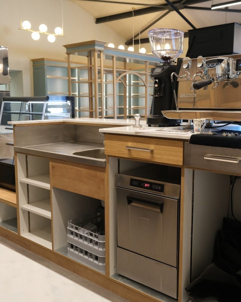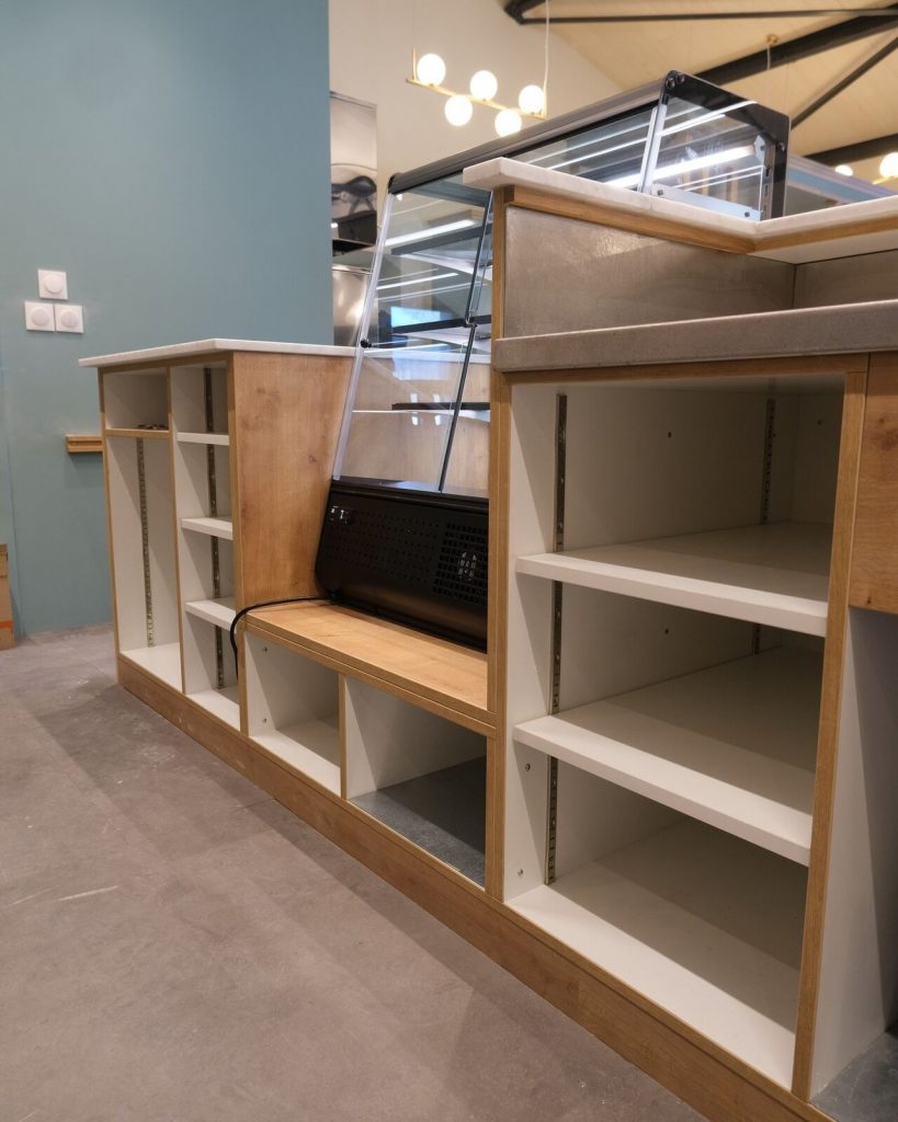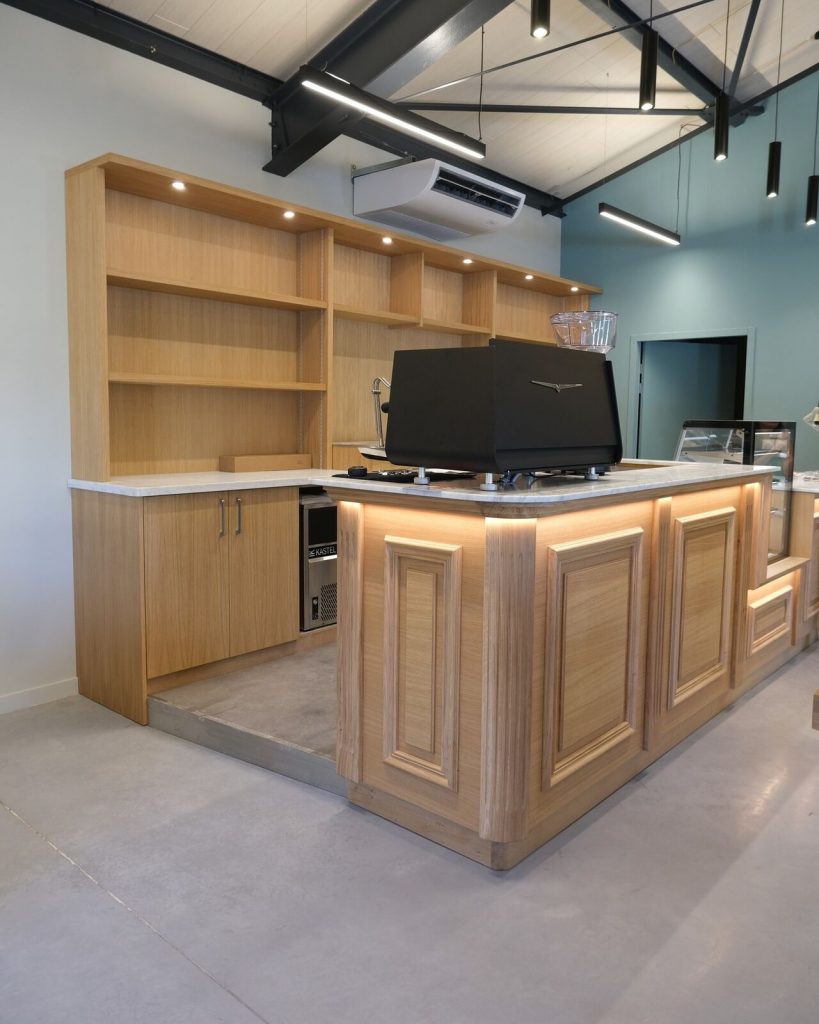 👉 Objectif : Créer un comptoir traditionnel et chaleureux pour mettre en valeur les deux machines à café, le moulin et une superbe collection d’anciens moulins.